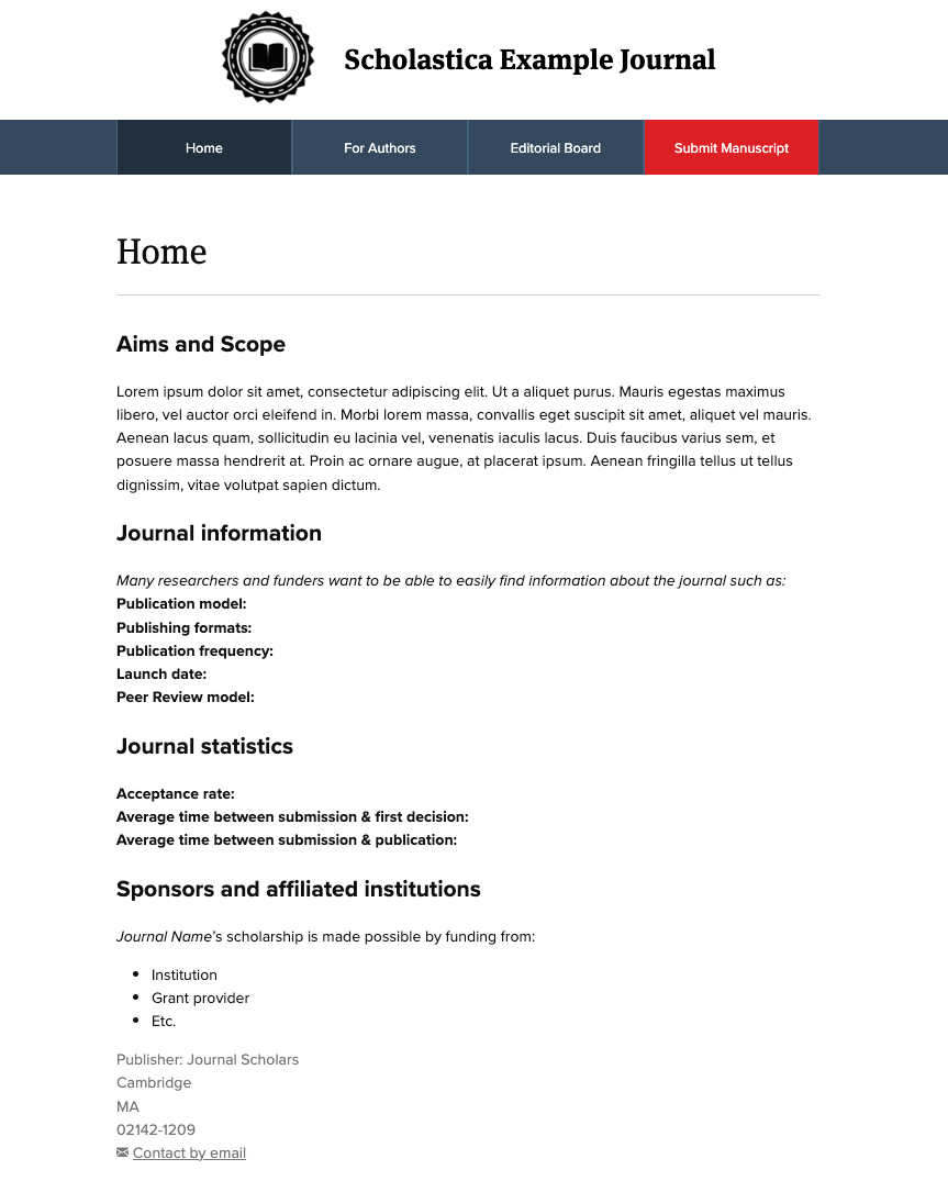 Your journal's admin editor will navigate to My Journals > Settings > Journal Settings > click "Edit" under Journal Profile. Scroll down and fill in the journal description, the "For Authors" submission guidelines, the editorial board information, and upload a journal cover before saving your changes.