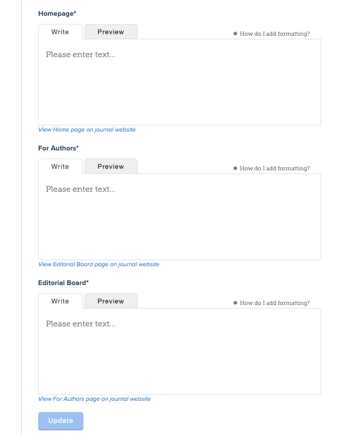 You must fill in your Homepage, For Authors (submission guidelines and instructions), and Editorial Board page information. The admin editor will fill in that information by navigating to the Journal's Journal Profile in the Journal Settings , and clicking "Edit" under Journal Profile.