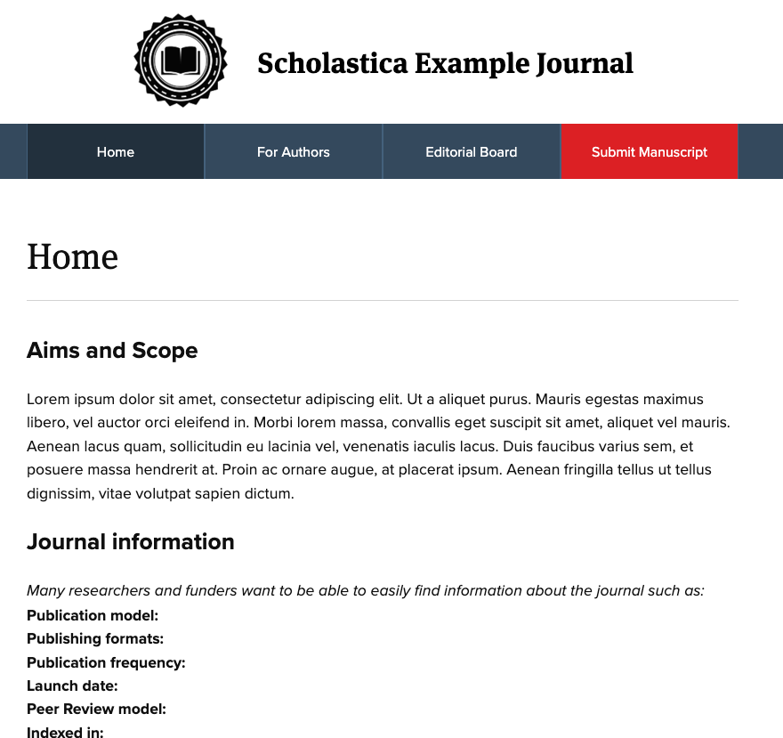 The homepage is a great place to include an overview of your journal, its history, what types of content and topics you publish, and more. The For Authors page should include any important guidance and details on requirements you want authors to include when they submit to your journal. The Editorial Board page should include the names and any other pertinent information about your current editorial team, as well as their roles at the journal.