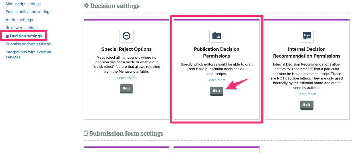 If you'd like to update an editor's ability to issue a decision after they've already been invited, the admin editor for your journal can do so by navigating to My Journals > Peer Review > Peer Review Settings > Decision Settings > Publication Decision Permissions.
