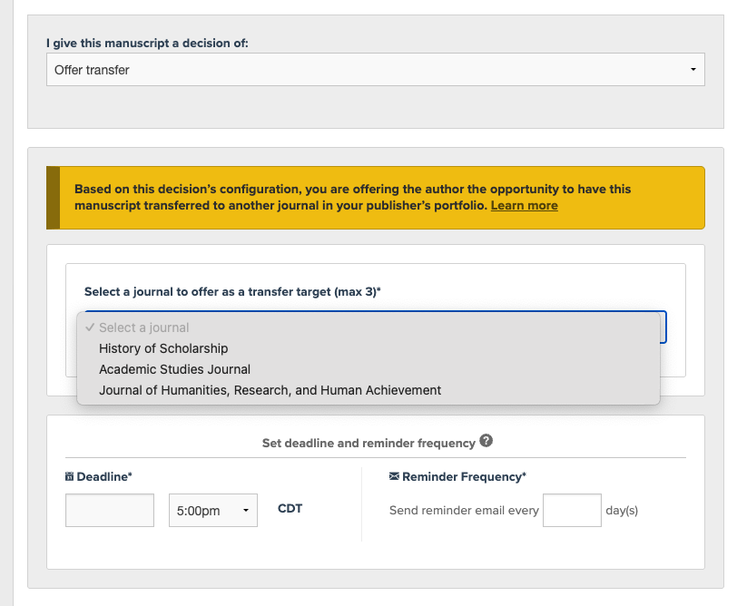 - Choose a journal (or journals) to offer the author as a transfer target (they'll then have to select and affirm their choice or decline your offer).