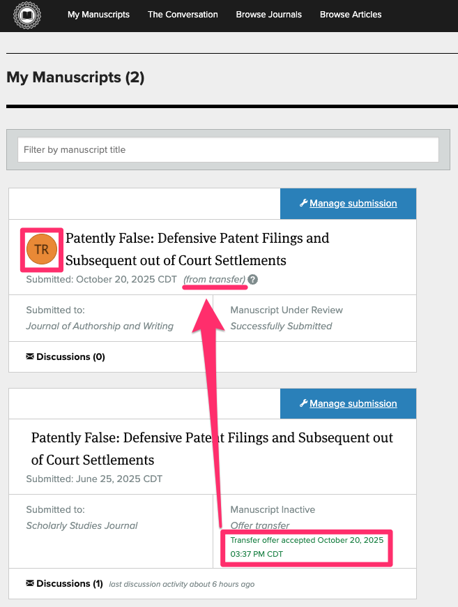 - The transferred manuscript will show with a Transfer (TR) logo to make it easy to tell at a glance that this new submission of the paper was transferred from another journal.