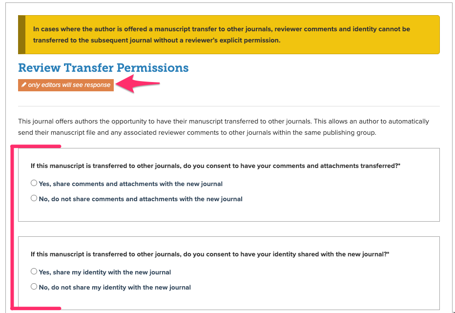 - If your journal has activated the manuscript transfer feature, reviewers that submit reviews for your journals will be asked "If this paper is transferred to another journal, do you consent to have your identity shared with the editors of that journal?" Note that authors would not see reviewer information, only the editorial team would if the reviewer consents to share that information with Journal B.